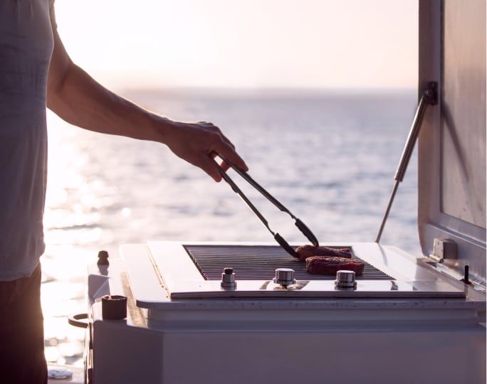 الحل الأمثل: اشترِ شوايات صغيرة وسهلة النقل مناسبة للشواء بجانب المياة. أفضل مادة هي الفولاذ المصمم للاستخدام في البيئة البحرية، فهو مضاد للصدأ والتآكل. يجب أن تكون الشواية خفيفة الوزن بما يكفي لحملها بسهولة، ولكن يجب أن تكون ثابتة بما يكفي بحيث لا تتحرك مع تأرجح القارب. يقلل ذلك من الإهلاك والتآكل، خاصة في مناخ قطر، بسبب التعرض المستمر للمياه المالحة. كما أنه يجعل عملية التنظيف أسهل بكثير!